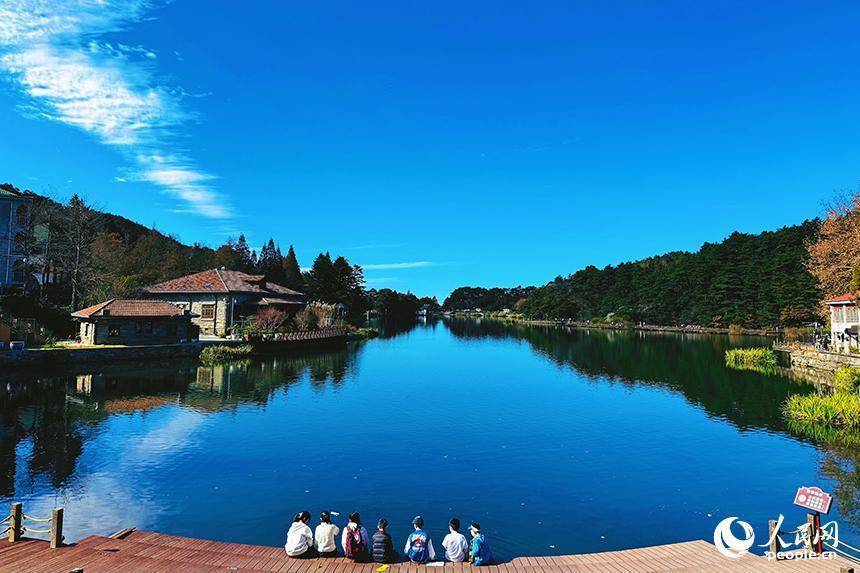 江西省庐山市庐山风景区如琴湖的迷人风景。人民网记者 邱烨摄人民网庐山11月18日电 (记者邱烨)初冬时节,江西庐山迎来一年中别具风情的斑斓季节。如琴湖畔,层林尽染,碧波轻漾,暖阳倾洒山间,为连绵山色铺上绚丽色彩。游客徜徉其间,或漫步湖畔,或驻足留影,尽享这幅自然天成的山水画卷。